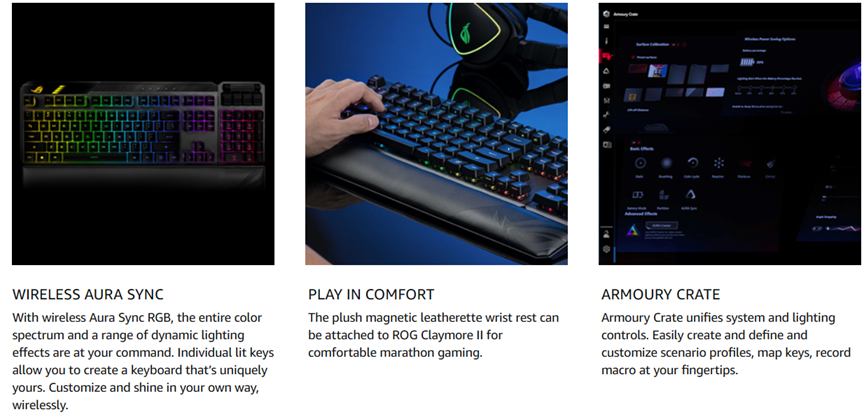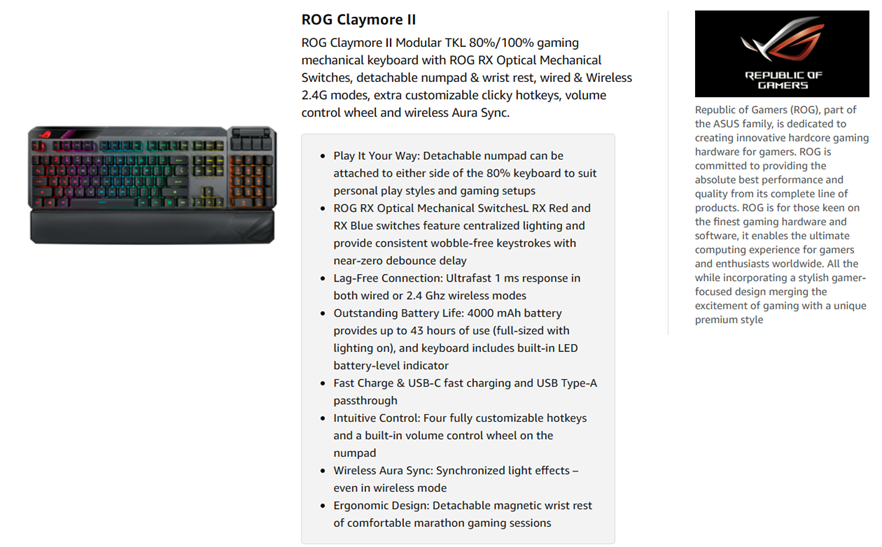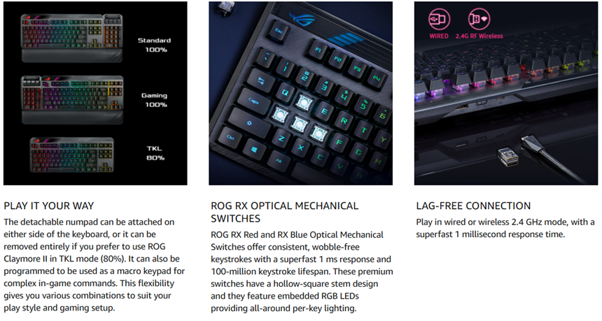 • VERSATILITY EVOLVED – With the ROG Claymore II, you can create your ideal gaming setup by placing the new detachable numpad on whichever side you prefer; then choose between wired or wireless mode and light it all up with Aura Sync. Assume full tactical control with ROG RX Optical Mechanical Switches and customizable hotkeys.