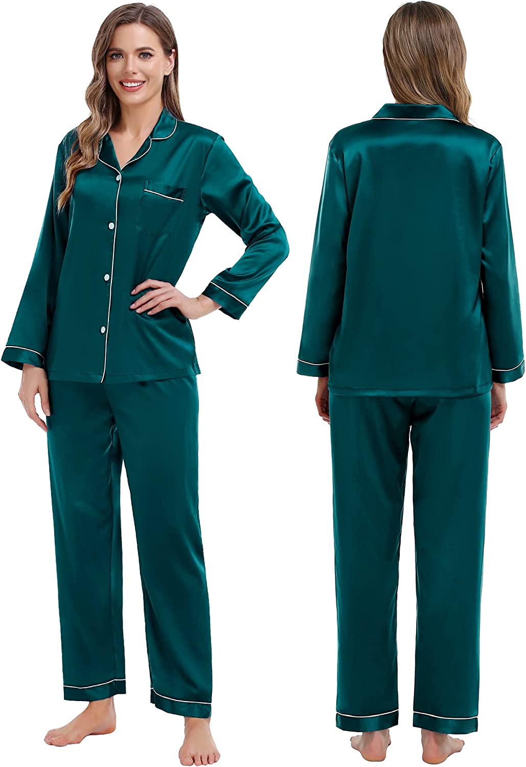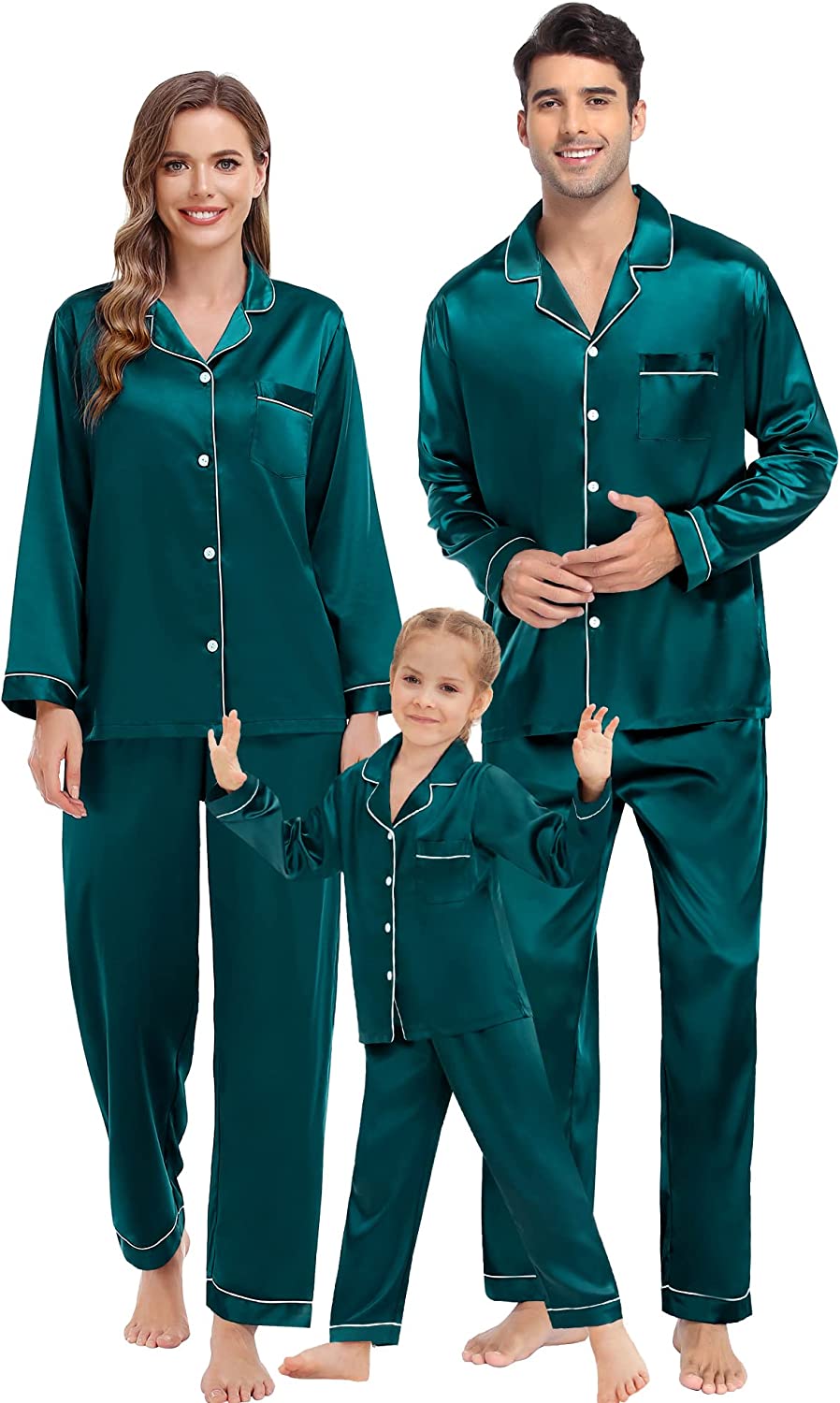 SWOMOG Family Matching Pajamas Set Silk Satin Button Down Sleepwear Long Sleeve Nightwear 2 Pcs Pj Set