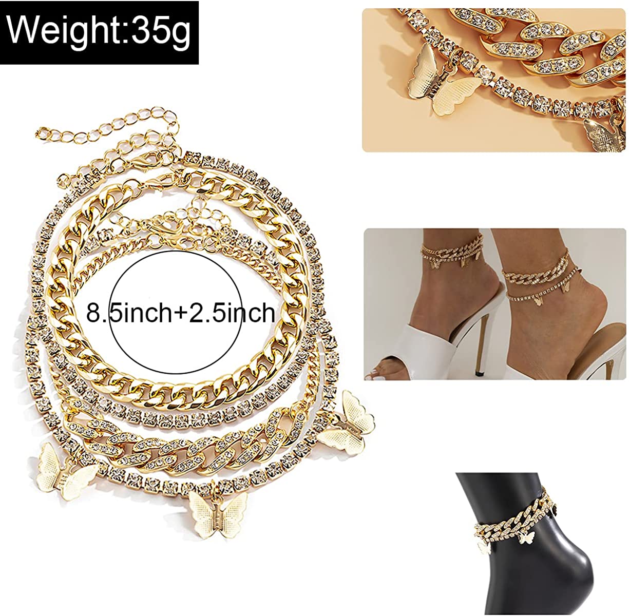 HaHaGirl Layered Butterfly Anklet for Women Girls Charms Butterfly Ankle Gold Silver Rhinestone Cuban Anklets Hip Hop Bulk Adjustable Braided Chain Anklet for Summer Beach