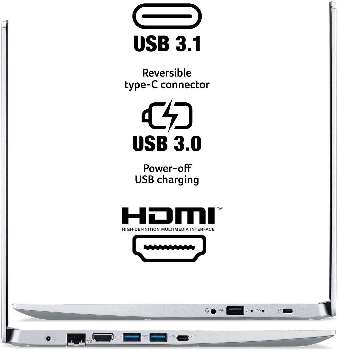 Acer Aspire 5 A515-55-35SE comes with these high level specs: 10th Generation Intel Core i3-1005G1 Processor 1.2GHz with Turbo Boost Technology up to 3.4GHz (4MB Smart cache), 15.6" Full HD (1920 x 1080) widescreen LED-backlit IPS Display, Intel UHD Graphics, 4GB DDR4 On-Board Memory, 128GB NVMe SSD, 1 - Available Hard Drive Bay, True Harmony Gen 2 Technology, Two Built-in Stereo Speakers, Acer Purified.Voice Technology with Two Built-in Microphones, Intel Wireless Wi-Fi 6 AX201 802.11ax Dual-Band 2.4GHz and 5GHz featuring 2x2 MU-MIMO technology (Max Speed up to 2.4Gbps), 10/100/1000 Gigabit Ethernet LAN (RJ-45 port), Bluetooth 5.0, Back-lit Keyboard, Acer Fingerprint Reader supporting Windows Hello, HD Webcam (1280 x 720), 1 - USB 3.1 (Type-C) Gen 1 port (up to 5 Gbps), 2 - USB 3.1 Gen 1 Port (one with Power-off Charging), 1 - USB 2.0 Port, 1 - HDMI Port with HDCP support, Lithium-Ion Battery, Up to 8-hours Battery Life, Windows 10 Home (S mode), 3.97 lbs. | 1.8 kg (system unit only) (NX.HSPAA.00A)