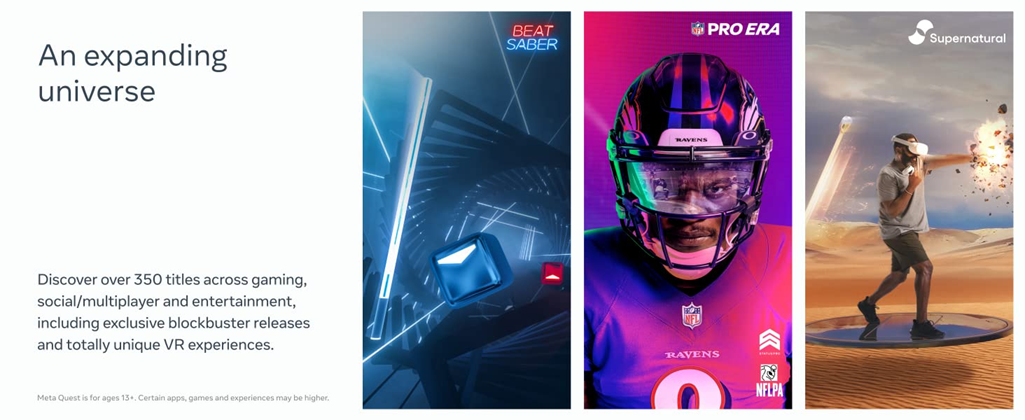• Meta Quest is for ages 13+. Certain apps, games and experiences may be suitable for a more mature audience.