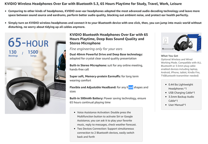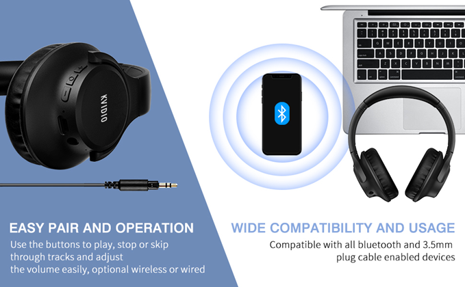 - WIDE COMPATIBILITY: Simply press multi-function button 2s and the over ear headphones with mic will be in ready to pair. KVIDIO wireless headsets are compatible with all devices that support Bluetooth or 3.5 mm plug cables. With the built-in microphone, you can easily make hands-free calls or facetime meetings while working at home