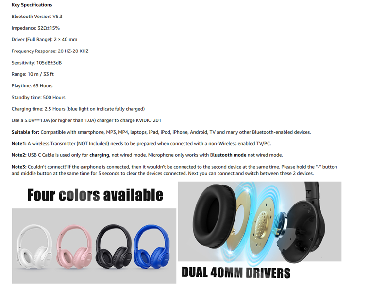 - SEAMLESS WIRELESS CONNECTION: Updated Bluetooth version V5.3 ensures an ultra fast and virtually unbreakable connection up to 33 feet (10 meters). Rechargeable 500mAh battery can be quick charged within 2.5 hours. After 65 hours of playtime, you can switch KVIDIO Cordless Headset from wireless to wired mode and enjoy your music NON-STOP. No worry for power shortage problem during long trip