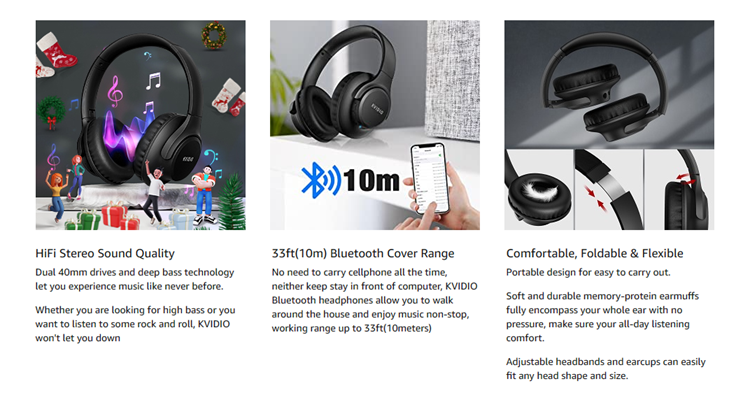 - HIGH FIDELITY STEREO HEADPHONES: KVIDIO upgraded bluetooth headphones with dual 40mm drivers and noise isolation technology, offers an almost concert hall-like feel to your favorite music as close as you're watching it live. Provide high-quality reproduction of sound for listeners, audiophiles, and home audio enthusiasts