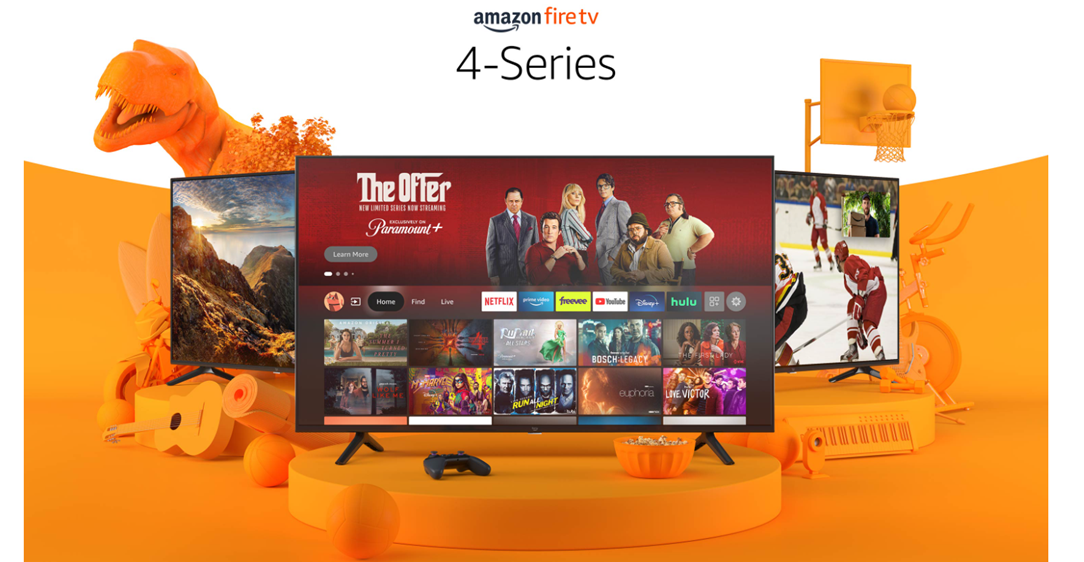 This bundle includes an Amazon Fire TV 43" 4-Series, Sanus Universal Tilting Wall Mount, and Mission Cables Red Remote Cover.