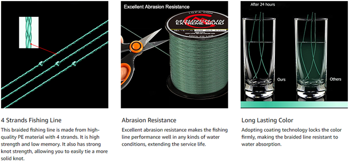 • Long Lasting Coating - Unlike braid lines using water-based dyes that wear off easily and allow water to penetrate the fibers, the braided line utilizes an unique coating that is the best at preventing color fading and color loss, and increases UV resistance.