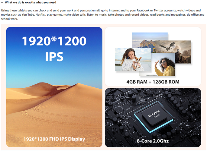 • 【Full HD screen with dual speakers】The display has 1920x1200 physical pixels, As a result, the outstanding screen-to-body ratio is almost 90%.This is especially advantageous for working but also very convenient for entertainment.Finally, it is very eye-friendly due to dark theme and eye comfort mode.We offer a 1-year return and exchange service.Please contact us if you have other questions about this tablet.