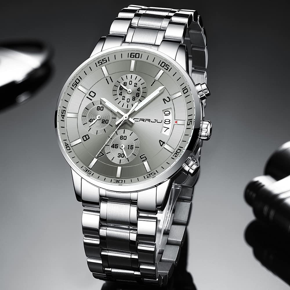 CRRJU Men's Fashion Stainless Steel Watches Date Waterproof Chronograph Wristwatches,Stainsteel Steel Band Waterproof Watch