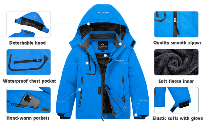 • Waterproof Snow Coat: Made from professional Durable Water Repellent (DWR) coated polyester fabric, which is windproof and durable. This coat can fights bad rainy or misty weather.