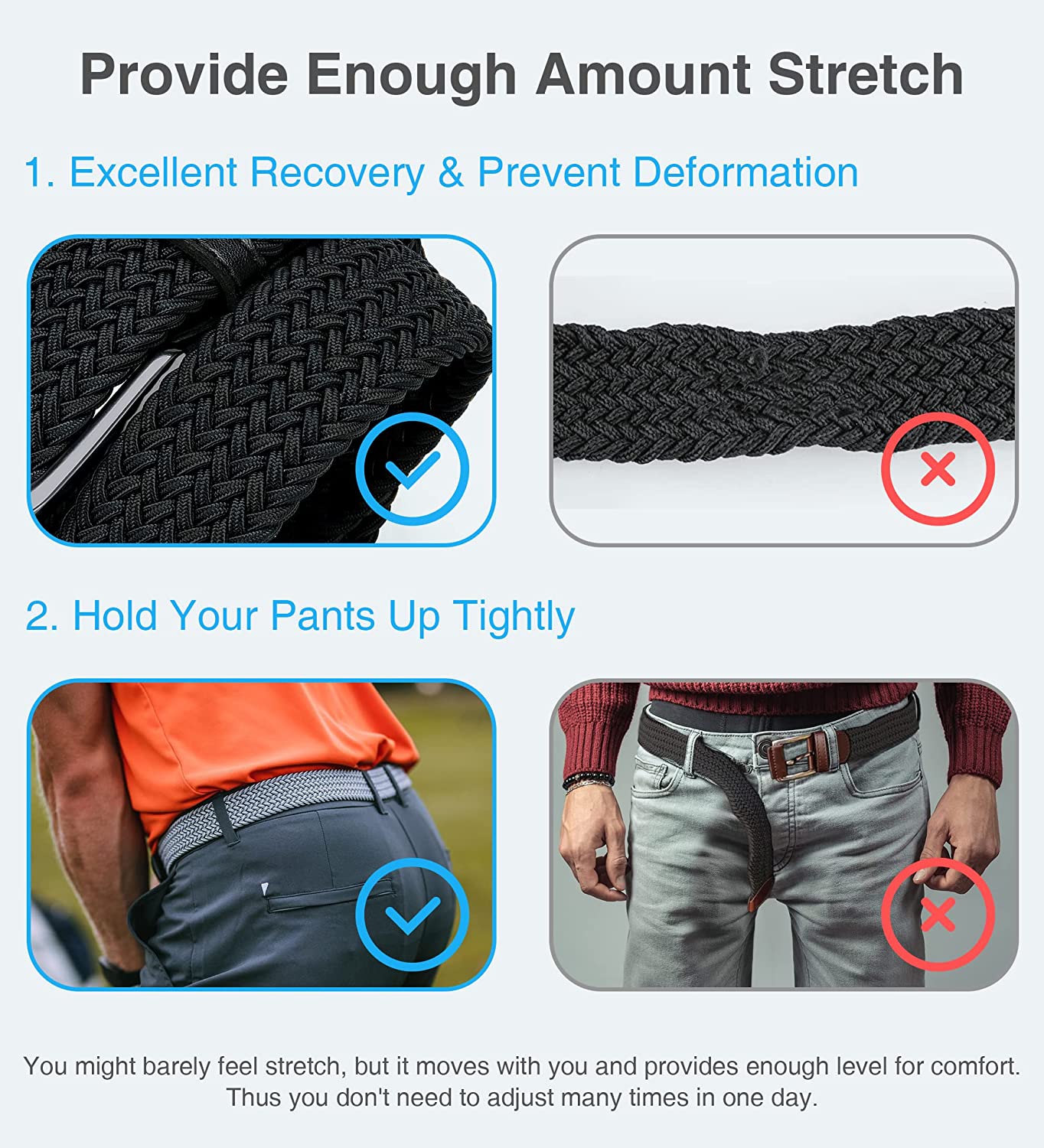 【Casual Design】: Leather end pieces for elevated style. Through the big data of selling 2 million belts, we have screened out the most popular color matching schemes, mens stretch belt can meet most of the wearing needs such as jeans, golf pants, casual pants, etc.