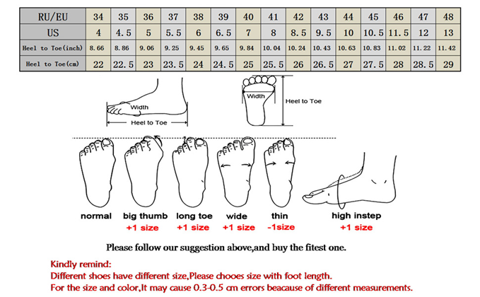 Size 6 :Heel to Toe 24cm =9.45 inch=RU/EU 38 Size 6.5 :Heel to Toe 24.5cm =9.65 inch=RU/EU 39 Size 7 :Heel to Toe 25cm =9.84 inch=RU/EU 40 Size 8 :Heel to Toe 25.5cm=10.04 inch=RU/EU 41 Size 8.5 :Heel to Toe 26cm =10.24 inch=RU/EU 42 Size 9.5 :Heel to Toe 26.5cm=10.43 inch=RU/EU 43 Size 10 :Heel to Toe 27cm =10.63 inch=RU/EU 44 Size 10.5:Heel to Toe 27.5cm=10.83 inch=RU/EU 45 Size 11.5:Heel to Toe 28cm =11.02 inch=RU/EU 46 Size 12 :Heel to Toe 28.5cm=11.22 inch=RU/EU 47 Size 13 :Heel to Toe 29cm =11.42 inch=RU/EU 48