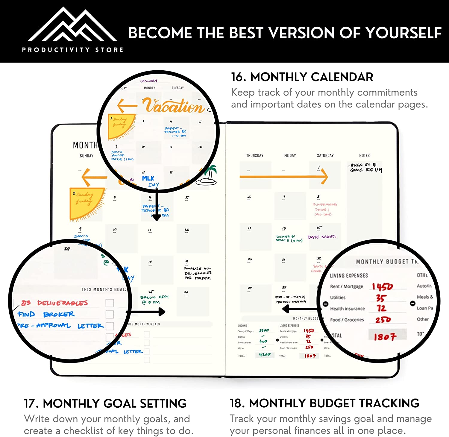 ✅ SAY HELLO TO THE PLANNER THAT WILL CHANGE YOUR LIFE: Crush your personal and professional goals with Productivity Store’s flagship planner. Get that promotion, start that business or break that bad habit. Evidence-based layouts that increase goal-setting success, happiness and work-life balance.