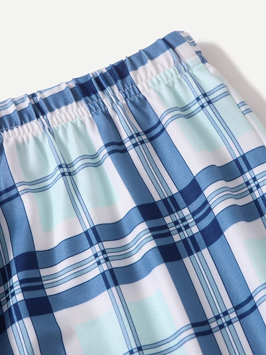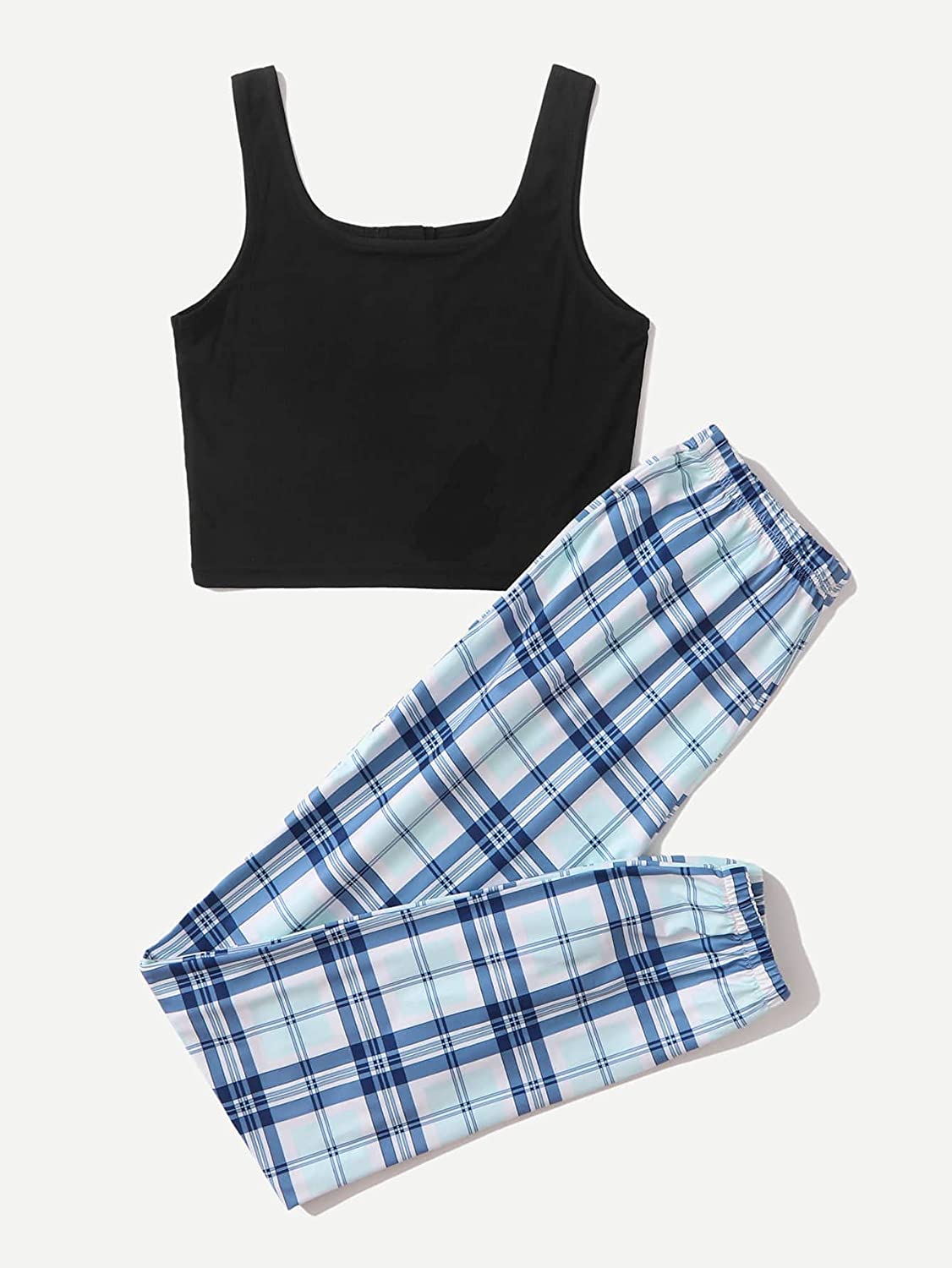 SheIn Women's 2 Piece Sleeveless Button Front Crop Tank Tops and Plaid Pants Pajama Lounge Set