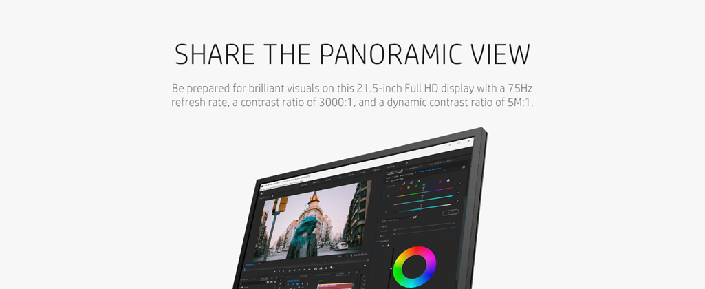 Browse the web, stream your shows, and get work done on the everyday HP V223ve FHD Monitor. This HP computer monitor’s 21.5-inch Full HD screen boasts unparalleled visuals every time you turn it on (1). What’s more is that the 1080p monitor features a 75Hz refresh rate for smoother images, plus a superb contrast ratio for better color differentiation (2). No matter where you view your HP monitor, the VA panel ensures image clarity is maintained across ultra-wide 178-degree horizontal and vertical viewing angles. Easily connect a laptop, an external storage drive, or an additional monitor with the HDMI and VGA ports. Get the most out of a PC monitor designed for both comfort and efficiency. The TÜV certified Low Blue Light Mode limits the strain put on your eyes, while the tilt-adjustable display ensures comfortable posture all day. Beyond this HDMI monitor’s comfort settings, the narrow bezel design keeps things stylish and productive, letting you see more of your favorite show or word document. Customize your display with ease thanks to the intuitive HP Display Center software; through the host PC, you can personalize every little detail from display settings, screen partitioning, and even dimming the screen. Further customize the way you use this monitor with standard 100 x 100 millimeters VESA mounting options (3). This 75Hz monitor’s energy-efficient design isn't just for you but the environment too, as your device reduces power consumption and energy costs. Plus, the materials used in the packaging are 100% sustainably sourced and recyclable (4). Rest easy as your monitor is covered by an HP 1-year limited hardware warranty. (1) Full high-definition (FHD) content is required to view FHD images. (2) During video playback only, depending on series of frames or time duration. (3) Bracket not included. (4) 100% outer box/corrugate cushion packaging made from sustainably sourced certified and recycled fibers. Fiber cushions are made from 100% recycled wood fiber and organic material. Excludes plastic bags and plastic foam sheeting. 06/04/2021_r1 tg.