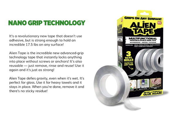 Alientape Nano Double Sided Tape, Multipurpose Removable Adhesive Transparent Grip Mounting Tape Washable Strong Sticky Heavy Duty for Carpet Photo Frame Poster Décor As Seen On TV (1 Roll)