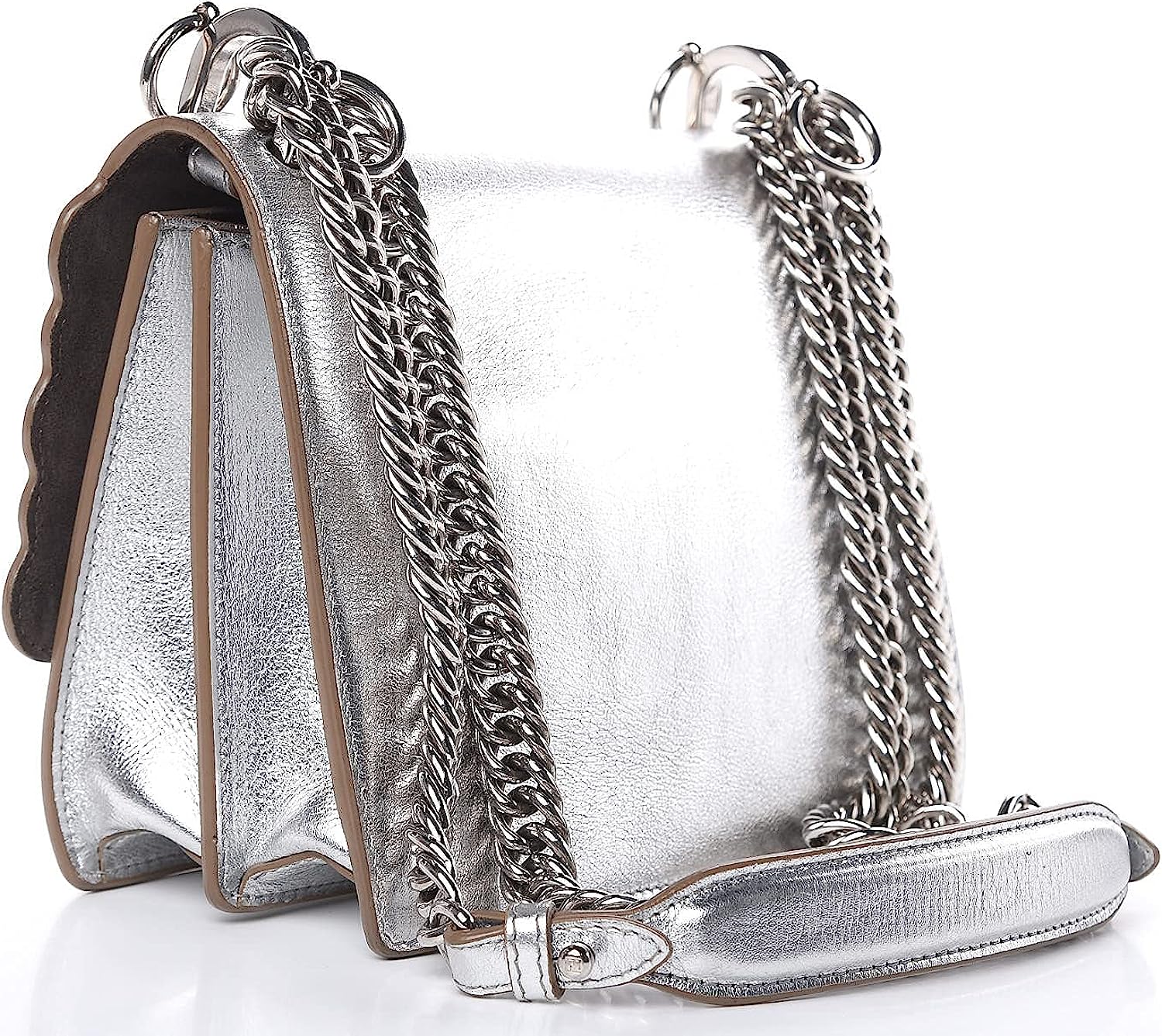 • This shoulder bag is crafted of smooth calfskin leather in metallic silver with scalloped edges. This shoulder bag features a long polished silver-tone chain link strap with a shoulder pad and silver rings on the anchor to hold bag charms. The front flap has a decorative pyramid stud closure. The front opens to a partitioned grey suede interior with a patch pocket. This handbag is perfect for day or evening use, from Fendi!
