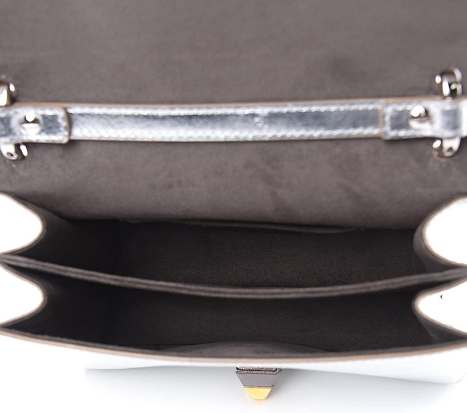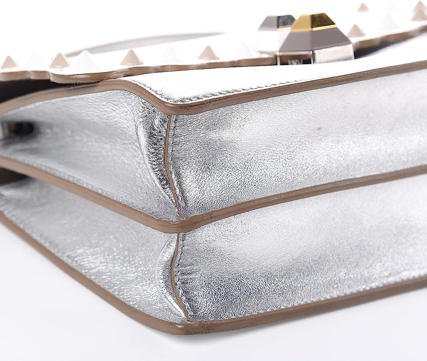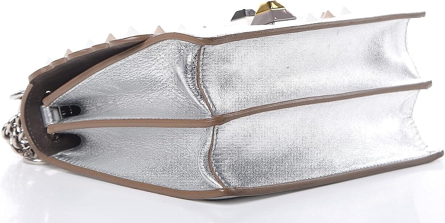 • Material: Calfskin Leather. Color: Metallic Silver. Iconic Fendi Studs. Silver-tone Hardware. Push Clasp Closure. Suede Interior Lining. Two Interior Compartments. One Interior Credit Card Slot