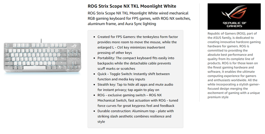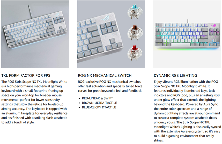 The ROG Strix Scope NX TKL Moonlight White is a compact, tenkeyless mechanical keyboard that features Xccurate Design – an extra-wide Ctrl key that's easier to feel and find in a frenzied FPS session. With a choice of ROG NX switches for optimal feel and reliability, an all-aluminum top plate for strength and style, and customizable Aura RGB lighting, Strix Scope NX TKL Moonlight White empowers you to play like a pro and rise above the competition. The ROG Strix Scope NX TKL Moonlight White is a high-performance mechanical gaming keyboard with a small footprint, freeing up space on your worktop for broader mouse movements – perfect for lower-sensitivity settings that slow the reticle for leveled-up aiming accuracy. The keyboard is topped with an aluminum faceplate for everyday resilience and it’s finished with a striking slash aesthetic to add a touch of style. ROG-exclusive ROG NX mechanical switches offer fast actuation and specially tuned force curves for great keystroke feel and feedback. ROG NX Brown mechanical switches provide a 1.8 mm actuation point for fast input. An initial actuation of 40 gram-force (gf) helps prevent accidental keystrokes, and it extends to 55 gf for perfect rebound feedback. As a result, keystrokes are instantaneous and have a smooth and linear feel. Enjoy vibrant RGB illumination with the ROG Strix Scope NX TKL Moonlight White. It features individually illuminated keys, lock indictors and ROG logo, plus an arresting RGB underglow effect that extends the lighting beyond the keyboard. Powered by Aura Sync, the entire color spectrum and a range of dynamic lighting effects are at your command to create a complete system aesthetic that's uniquely yours. The Strix Scope NX TKL Moonlight White's lighting is also easily synced with the extensive Aura ecosystem, so it's easy to build a gaming environment that really shines