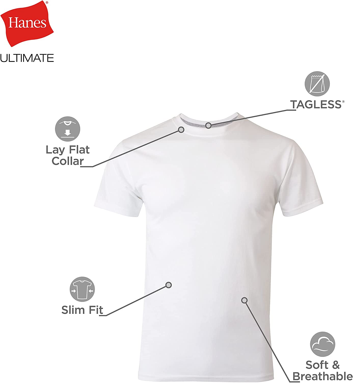 Here's a slim-fit tee that has all the best features of a classic cotton T-shirt but with the pared-down silhouette you prefer. Not surprisingly, it's from the experts at Hanes Ultimate®. This essential short-sleeve, crewneck tee has the trimmer shaping you want, with higher arm holes, a slightly narrower straight body, and tapered sleeve openings. Like many Hanes® classic tees, it's made of super soft Cool Comfort® ring-spun cotton that wicks away moisture to keep you cool and dry all day. Additionally, these better-than-basic tees are designed with odor protection technology that fights odor-causing bacteria for all-day freshness. You'll also appreciate the stay-flat crewneck and no-itch tagless design. Stock up on Hanes® slim-fit cotton tees in a convenient 4-pack.