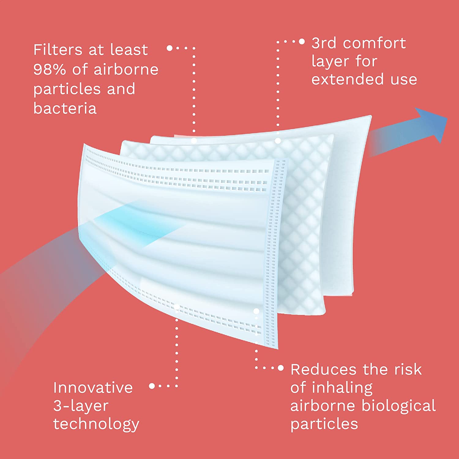 • 3 LAYERS OF PROTECTION: Our disposable mask is made of 3 highly protective layers of material. The 1st layer provides strong resistance against liquids, the 2nd layer is the filter layer, and the soft inner 3rd layer provides comfort.