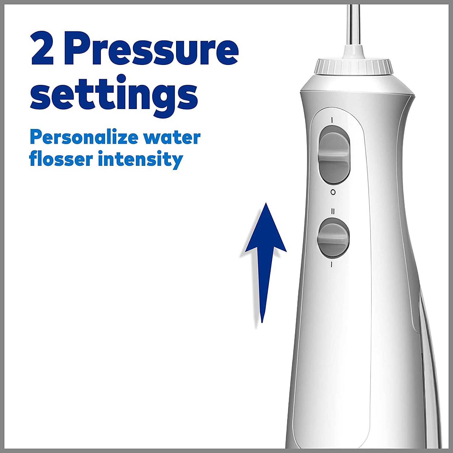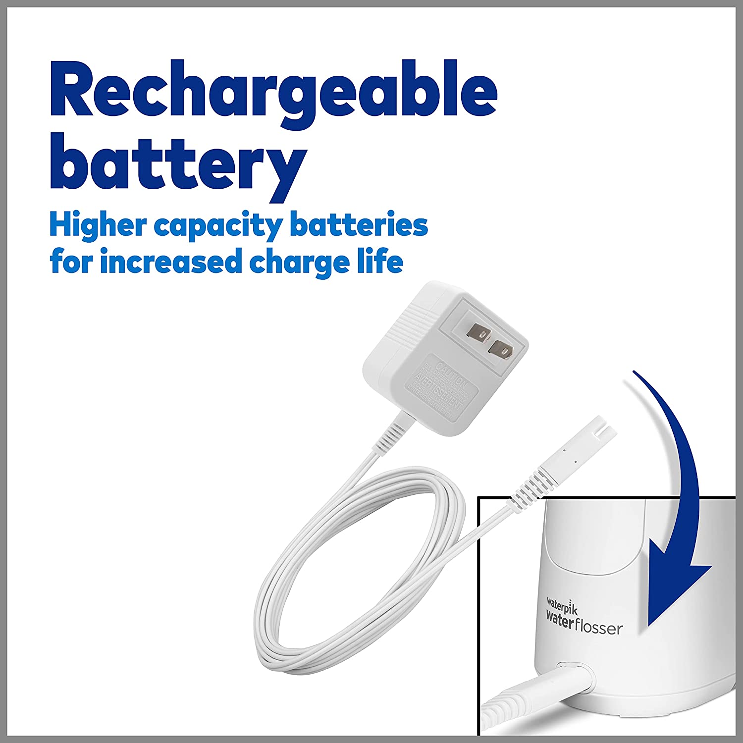 • KEY FEATURES: 4 tips, 2 pressure settings (45-75 PSI), removable 7 oz reservoir (top-rack dishwasher safe for easy cleaning), 45 secs of flossing time, rechargeable NiMH battery, charger (120VAC/60Hz North America only), 360 tip rotation, not for use in the shower.