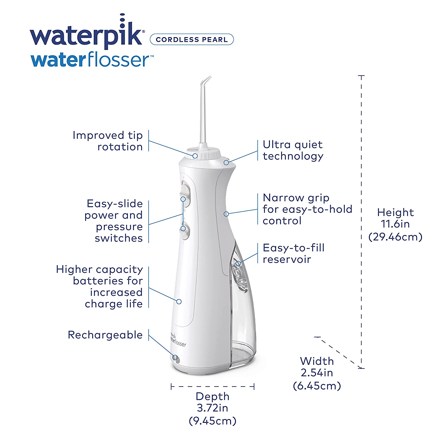 • ERGONOMIC AND QUIET: Narrow hand grip and improved 360-degree tip rotation provide enhanced maneuverability for a handheld water flosser, plus Cordless Pearl features our new quiet flossing technology.