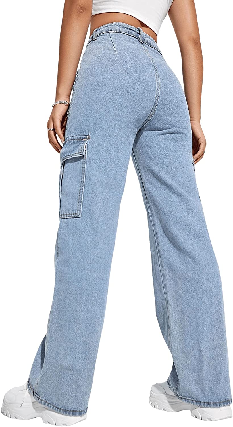 SweatyRocks Women's High Waist Cargo Jeans Flap Pocket Wide Leg Denim Pants/ Pattern Type: Plain/ Length: Long/ Type: Wide Leg, Cargo Pants/ Details: Pocket, Zipper, Button Front/ Fit Type: Loose/ Waist Line: High Waist/ Sheer: No/ Closure Type: Zipper Fly/ Fabric: Non-Stretch/