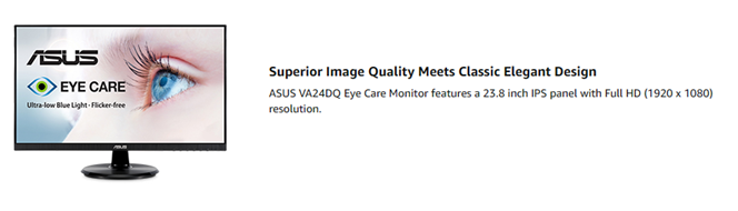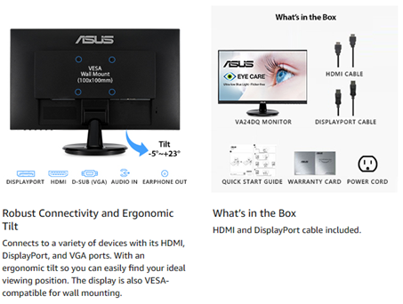 ASUS VA24DQ 23.8” Monitor, 1080P Full HD, 75Hz, IPS, Adaptive-Sync/FreeSync, Eye Care, HDMI DisplayPort VGA, Frameless, VESA Wall Mountable ,BLACK