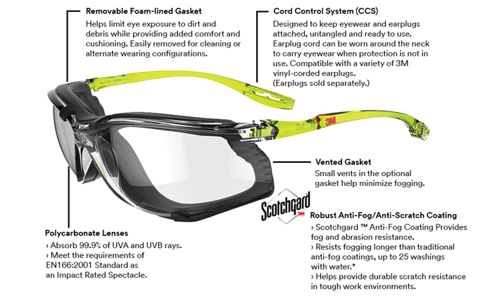 The 3M Solus CCS Series Protective Eyewear is designed to keep eyewear and earplugs attached, untangled and ready to use, so your team has the convenient, comfortable protection they need to focus on the jobs at hand. All models feature 3M Scotchgard Protector Anti-fog coating. A foam gasket is optional with small vents in the gasket help minimize fogging.