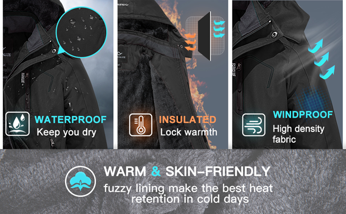 • Waterproof Snow Coat: Made from professional Durable Water Repellent (DWR) coated polyester fabric, which is windproof and durable. This coat can fights light rainy or misty weather.