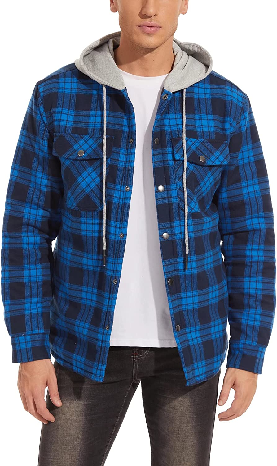 Men's Flannel Shirt Jacket with Hood Long Sleeve Quilted Lined Plaid Coat Button Down Thick Hoodie Outwear Winter