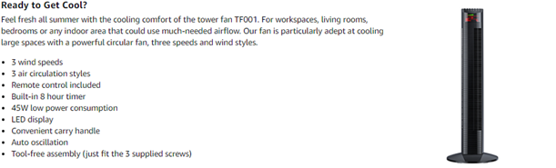 Included ComponentsLargeTower Fan, Remote Control, Use Guide
