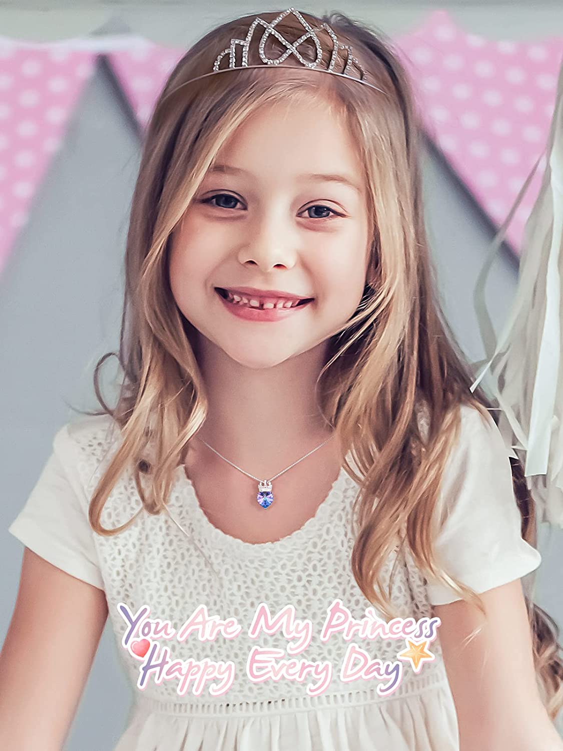 CDE Princess Queen Crown Necklace for Girls Women Love Heart Pendant Necklaces with Birthstone Crystal, Christmas Valentine’s Day Birthday Party Jewelry Gifts for Daughter Granddaughter Niece Teen Gir
