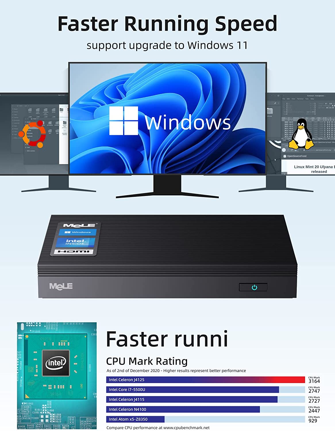 【Intel Gemini Lake Refresh J4125 Processor & Dual 4K UHD Screen Display】MeLE Mini Computer Windows 11 Pro equips with Intel J4125 Processor CPU ( Up To 2.7Ghz) ,Loaded with storage of 8G LPDDR4 (Maximum Memory Speed 2133 MHZ)+512GB Storage . Powerful hardware makes it run faster and more stable. In addition, The Mini Desktop PC also supports Ultra 4K HD Graphics, allowing two displays to connect at the same time, bringing you to experience a better display effect and effectively improve work efficiency.