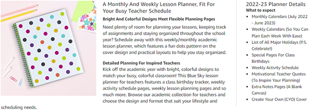 • Weekly view lesson planning pages offer ample lined writing space for detailed daily planning and classroom scheduling every day of the week so you can stay organized throughout the school year