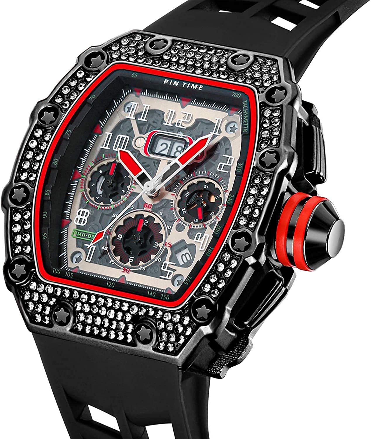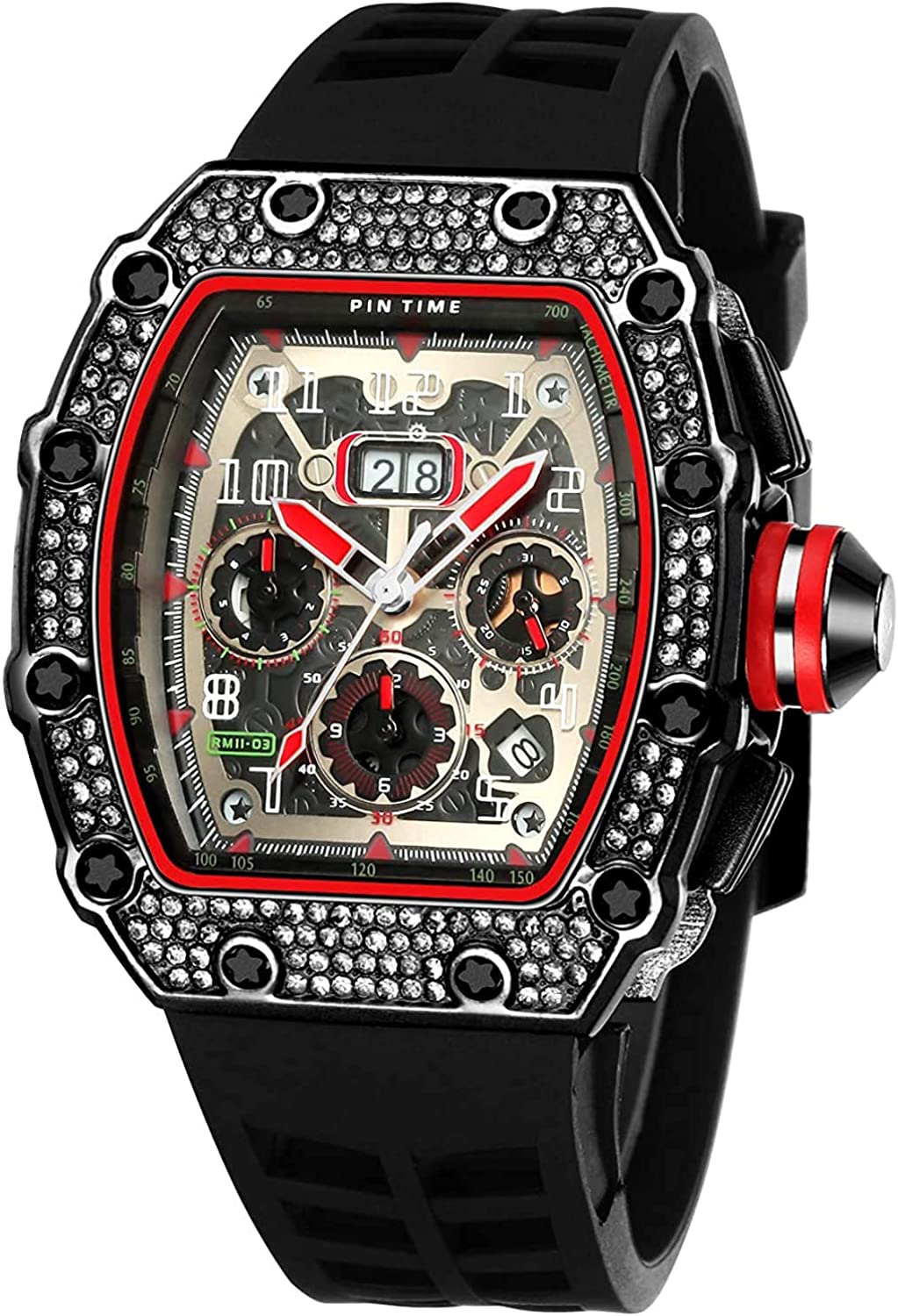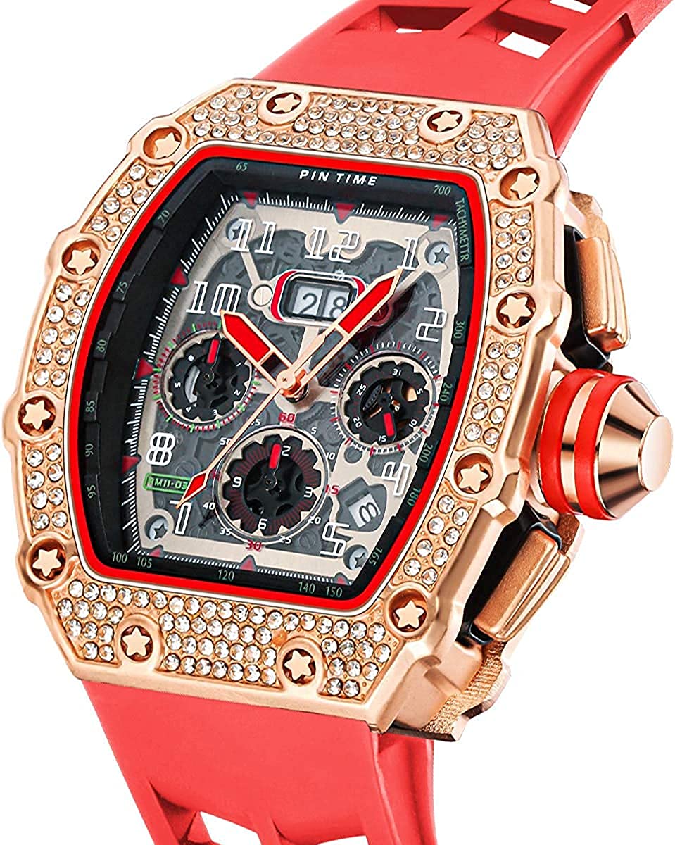 • ❤️️ Fashion Unique Design ❤️️ : Big face luxury watch for men, 44mm diameter Domineering oak barrel case accommodate the chronograph sub-dial, calendar window below 5 o'clock, Shiny iced-out bezel , Making the watch design more vibrant. Suitable for many indoor & outdoor scenes.
