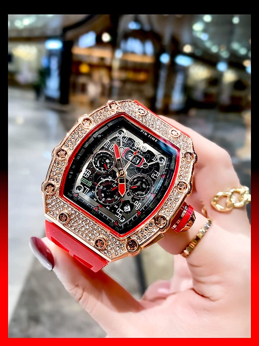 Gosasa Mens Diamond Watches Luxury Tonneau Watches for Men Analog Watch Chronograph Calendar Date Men’s Dress Business Work Watch Large Rectangle Face Wristwatch with Silicon Strap