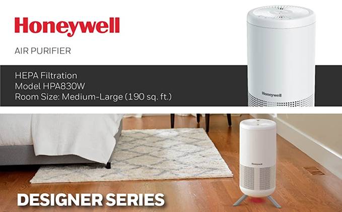 • MED-LARGE ROOM AIR PURIFIER – Honeywell HPA830W HEPA Air Purifier with 360 degree intake helps capture up to 99.97% of the following microscopic airborne allergens and particles: dust, pollen, pet dander, dust mite debris and smoke.*