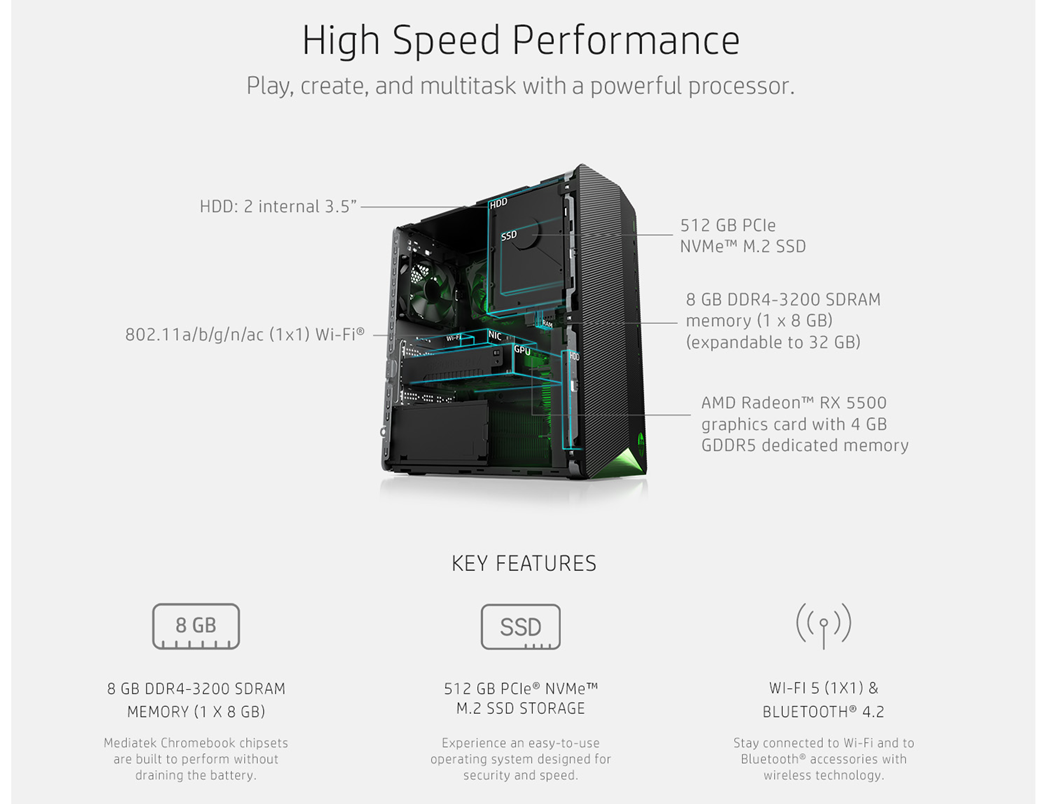 • MEMORY AND STORAGE – With 8 GB of RAM, everything from multitasking to playing games gets a performance boost (3); plus, with 512 GB of PCIe NVMe M.2 Solid State Drive storage, you’ll get up to 10x faster performance than a traditional hard drive (4) (5)