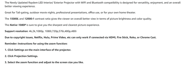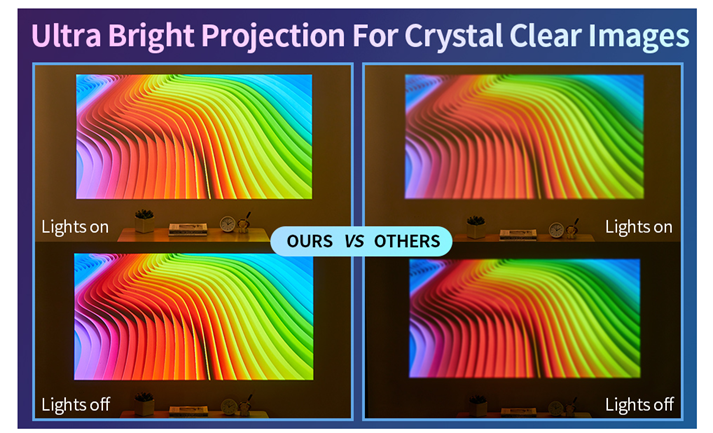 • ?【Native 1080P, 15000L & 550 ANSI Lumens, 4K supported】 2023 upgraded WiFi projector, using the original physical resolution of 1920x1080, has 3 layers of refractive glass lenses. Compared to our competitors who use single layer lenses, we use multi-layer refractive glass lense technology to reduce projecting blurry edges on screen. Its display is calculated to render sharper resolution to the full screen. It has 550 ANSI lumens, much brighter and more colorful than other 1080p projectors.