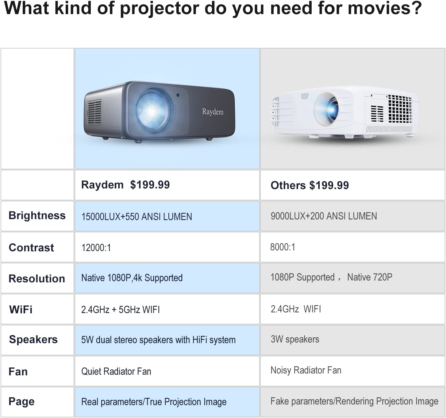 - ?【Native 1080P, 15000L & 550 ANSI Lumens, 4K supported】 2023 upgraded WiFi projector, using the original physical resolution of 1920x1080, has 3 layers of refractive glass lenses. Compared to our competitors who use single layer lenses, we use multi-layer refractive glass lense technology to reduce projecting blurry edges on screen. Its display is calculated to render sharper resolution to the full screen. It has 550 ANSI lumens, much brighter and more colorful than other 1080p projectors.