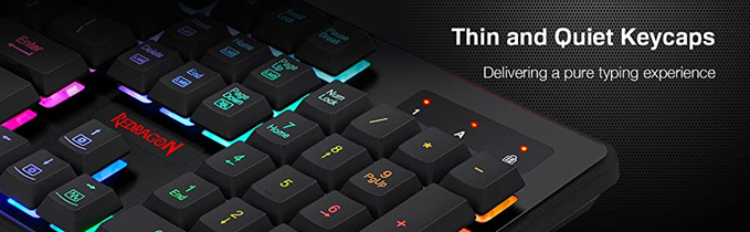 • RGB Backlit Mechanical Feel Gaming Keyboard, Redragon LED RGB Keyboard, 7 colors, 6 backlight effects, 4 backlight brightness levels and adjustable breathing speed, the illumination can be completely turned off