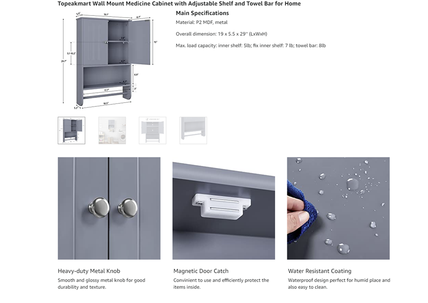 • Selected materials: Aiming to provide you with a safe and healthy living environment, this wall-mounted cabinet uses CARB-Certified Phase 2 MDF coated with water-resistant paint to free you from the harmful emissions. Solid construction easily bears up to 30kg/66lb.