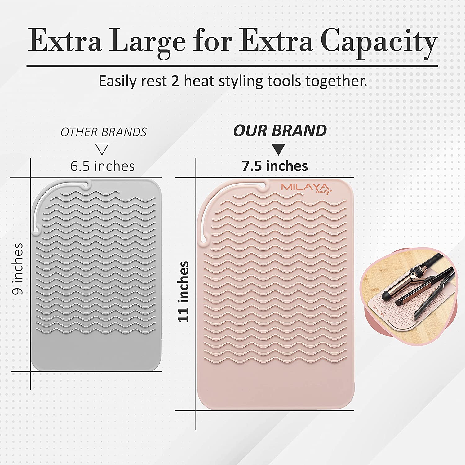 - LARGE SIZE & DURABILITY - The mat size has been conveniently resized larger 7.5 inch x 11 inch compared to our competition of 6 inch x 9 inch. It provides more space for multiple hot tools. Convenient design keeps hair styling tools from slipping and falling while the mat grips on the surface. Easy to clean. Wash with mild soap and warm water. Air dry.