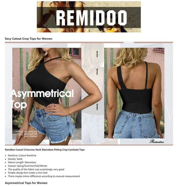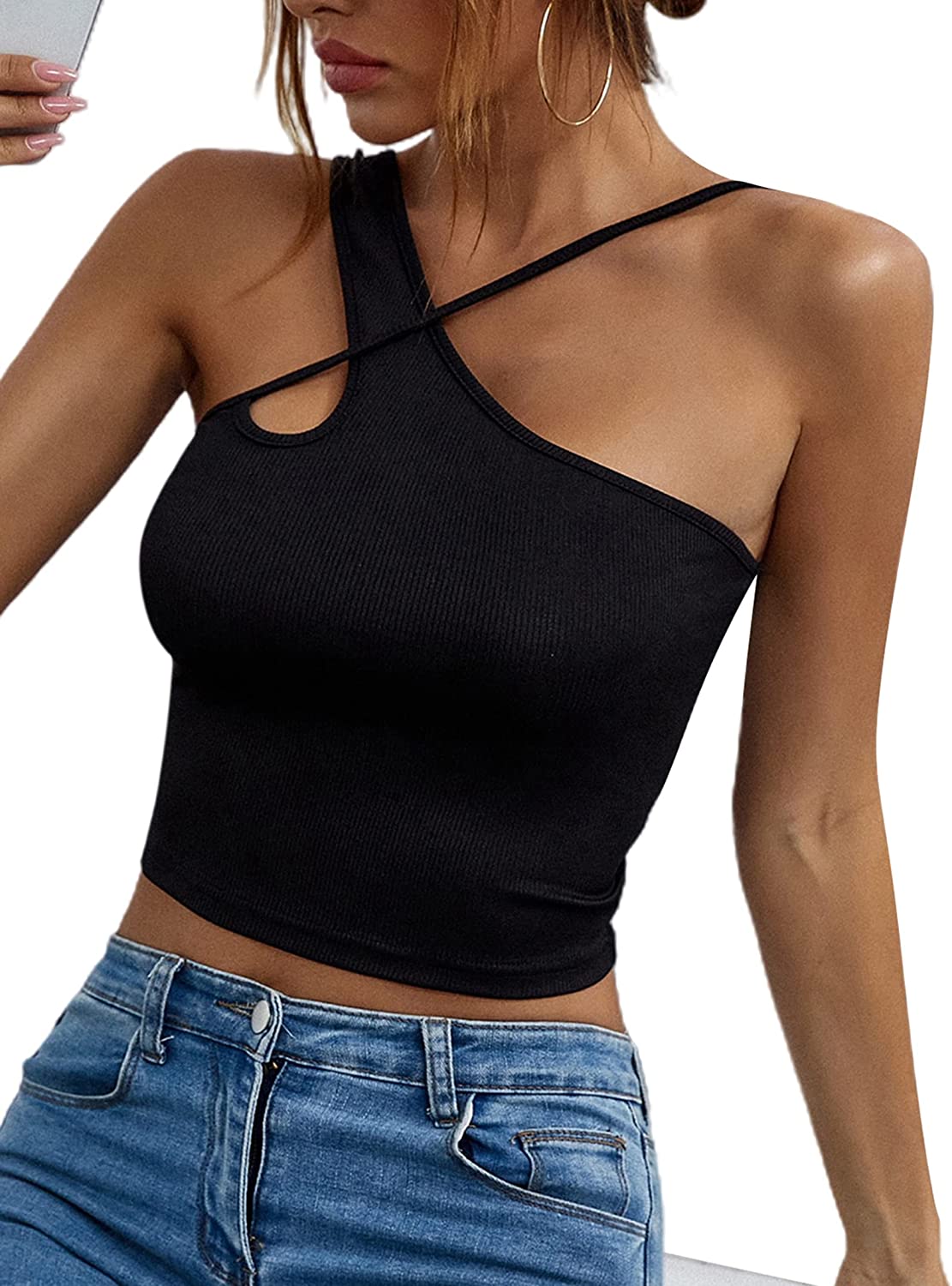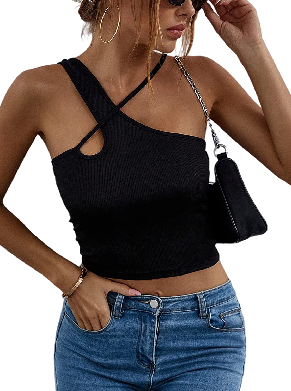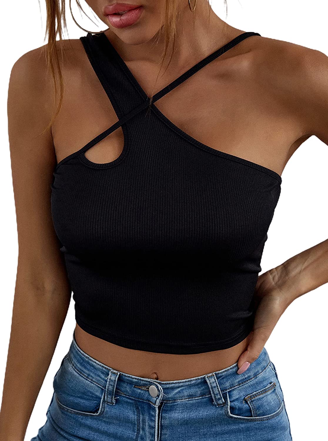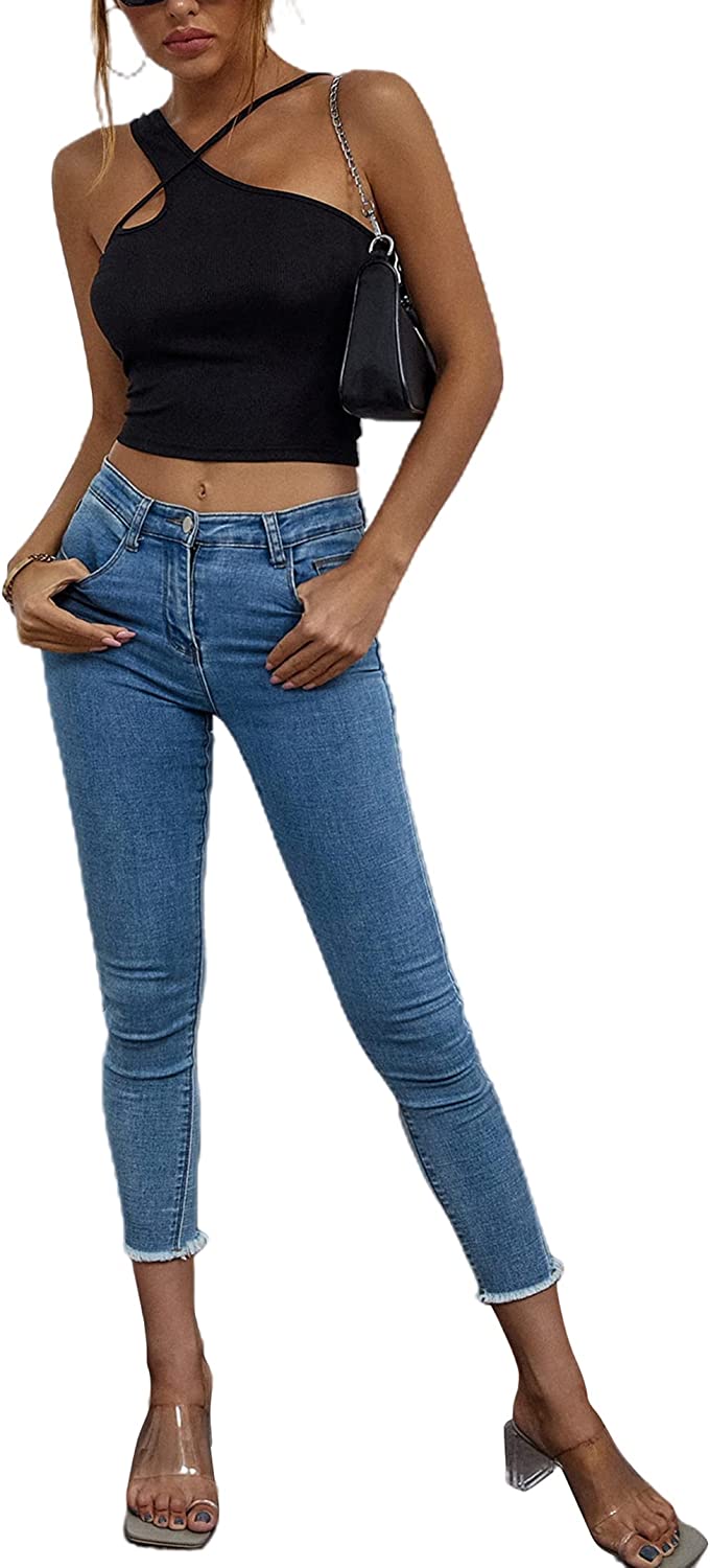 Remidoo Women's Sexy Strap Asymmetrical Neck Cutout Ribbed Knit Slim Fit Cami Crop Top