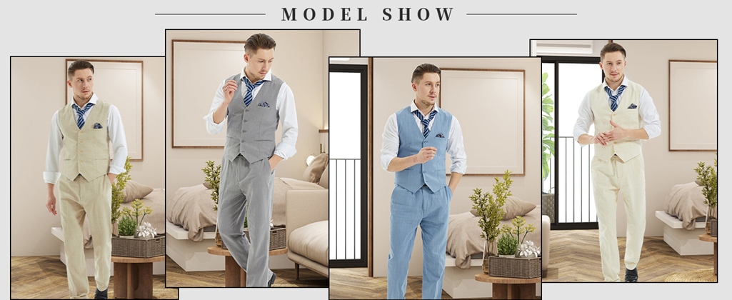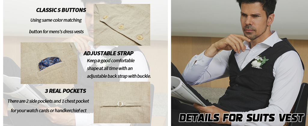 • FEATURE--Vest:Four Button,V-Neck,Smooth Back And Adjustable Back Tie,Slim Fit Style;Pants:Flat Front,Zippered Fly,Button End And Adjustable Waist Tab.