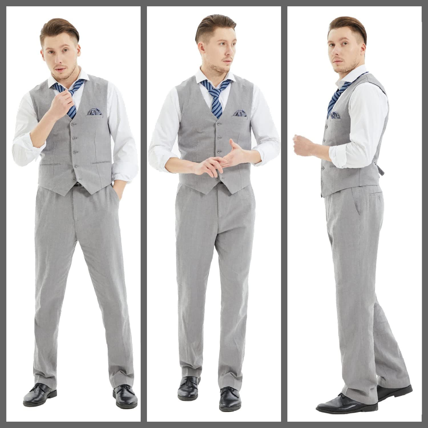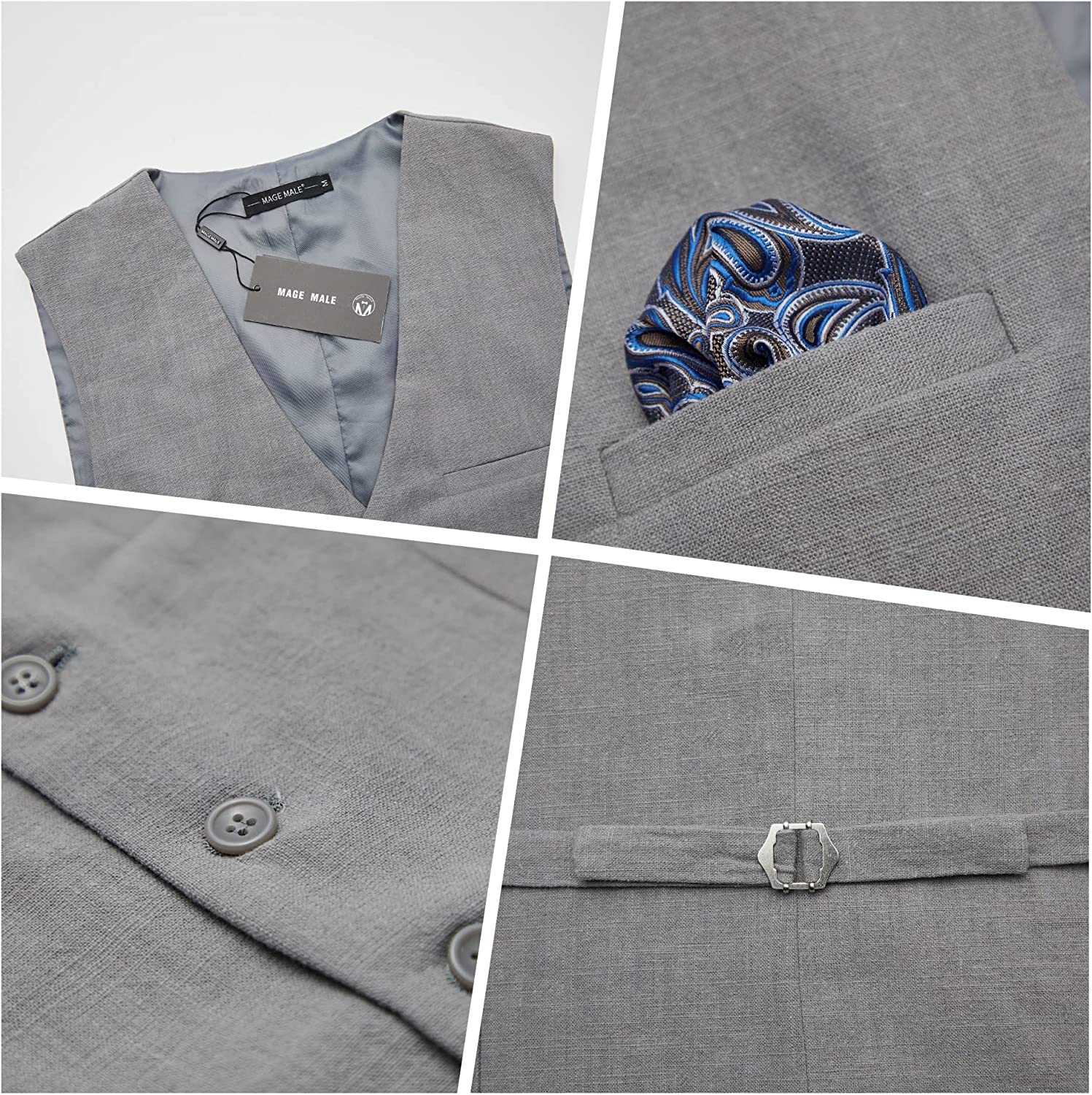 MAGE MALE Men's Linen 2 Piece Suit Slim Fit Wedding Groomsmen Summer Vest Pants Set with Pocket Square