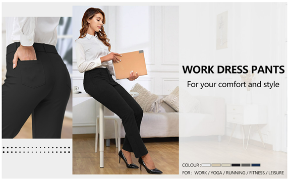 DRESS PANTS FOR WOMEN: (87%Polyester 13%Elastane) Belt loops, zipper fly with button, streamlined design, make these pants professional enough for business casual, work, office, yoga or golf.