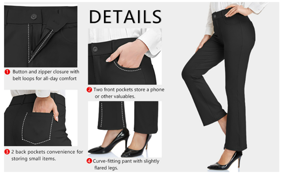 SLIGHT FLARE & ZIPPER-FLY STYLE: Featuring bootcut leg to conform to your body. High elastic waist, classic zipper fly and button closure. These relaxed fit pants are suitable for work or casual.