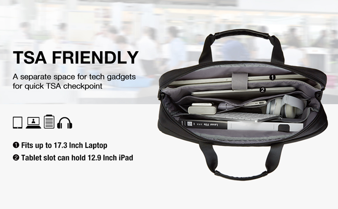 • TSA FRIENDLY & ANTITHEFT- Convenient at checkpoint. A separate tech compartment with large opening design can make you quickly pass at airport security, also keeping your 17.3 inch laptop, 12.9'' iPad and other tech gadgets tidy. Its metal anti-theft zippers will enhance the security of the computer bag.